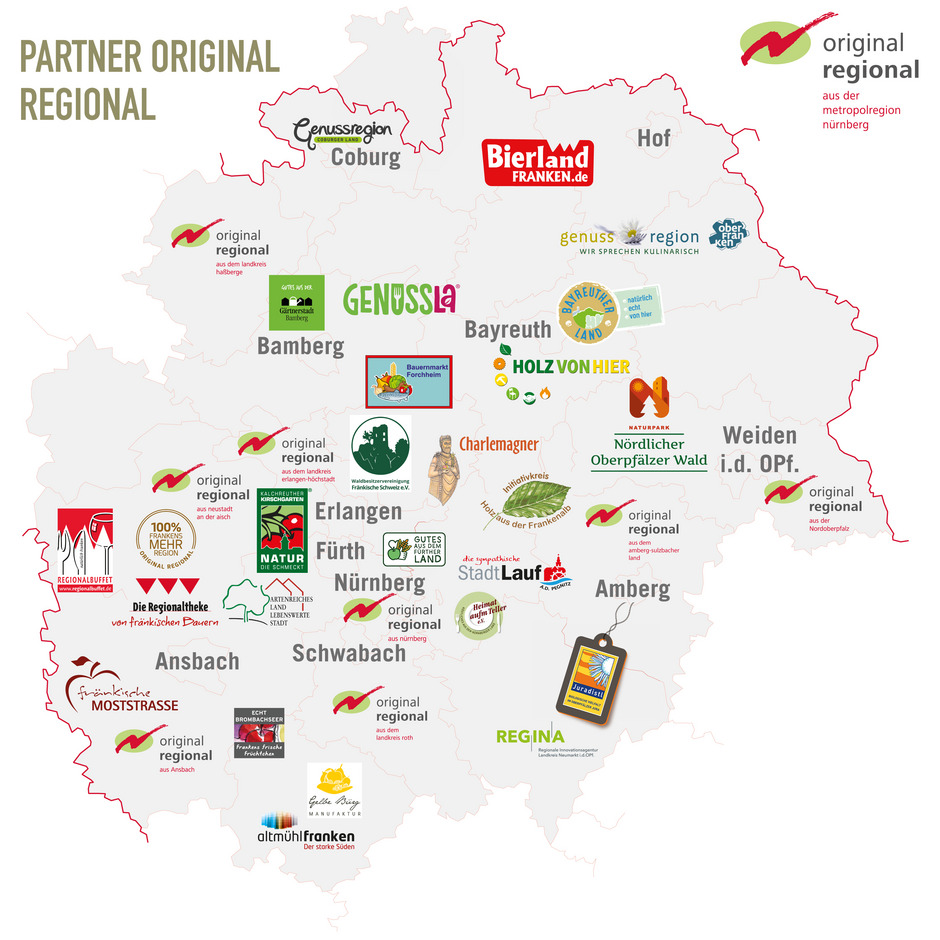 Die Partner:innen von Original Regional aus der Metropolregion Nürnberg auf einen Blick. Ein Zusammenschluss aus 35 Regionalinitiativen, in denen rund 2.000 Direktvermarkter und Erzeuger organisiert sind.