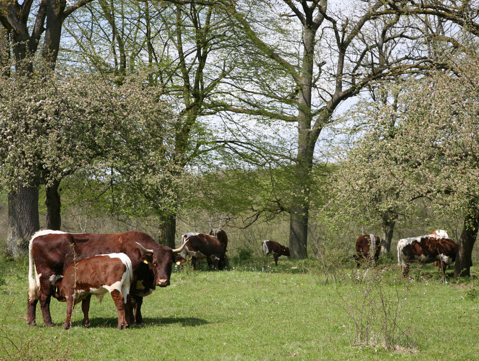 Nicht nur die Teiche, sondern auch die Flächen für vierbeinige Nutztiere prägen die Landschaft rund um Nürnberg. So zählen die Hutanger im Nürnberger Land zu den kulturlandschaftlichen Höhepunkten Bayerns. Hier wurden bis in die 60er Jahre des 20. Jahrhunderts vor allem Rinder gehütet. Diese traditionelle Tierhaltung wird heute wieder vermehrt praktiziert. Nicht nur Rinder, sondern auch Schweine und sogar Puten finden sich heutzutage auf der Weide. Dass sich dies in der Qualität des Fleisches widerspiegelt, beweisen die Seukendorfer Bio-Freilandpute von Weidefleisch Tiefel. Eine Besonderheit in der Hersbrucker Alb sind die Obstanger. Dabei handelt es sich um Obstbaumbestände, die auf Hutangern angelegt wurden. Erste Nachweise über Obstbäume auf diesen Baumweiden gibt es schon im 16. Jahrhundert. Während bis ins 18. Jahrhundert ein großer Teil der Obstbäume aus „wildem Obst“ bestand, erlebte die gezielte Anpflanzung von kultivierten Obstbäumen ab dem 19. Jahrhundert ihren Aufschwung.