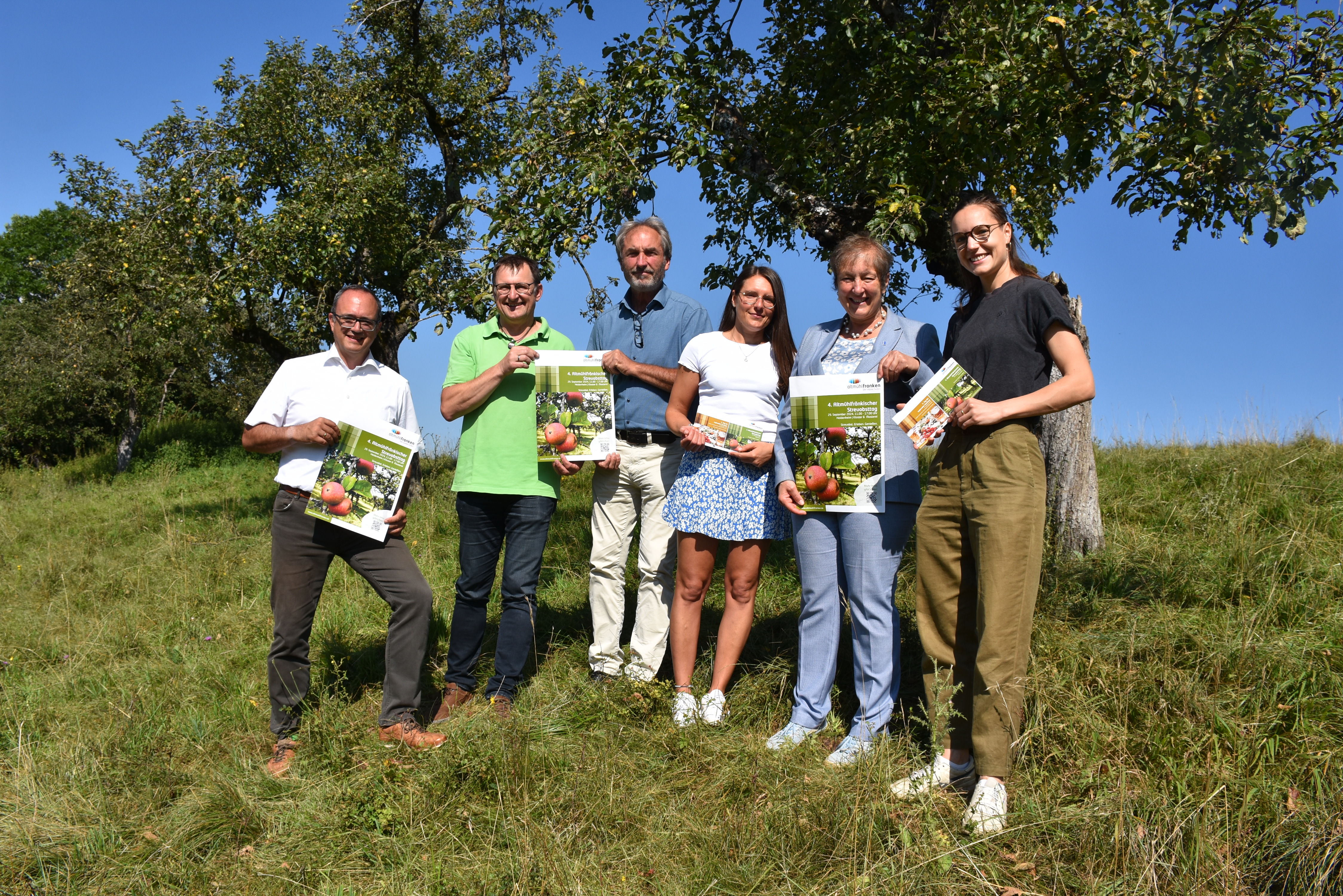 Die Organisatoren hoffen auf goldenes Herbstwetter in idyllischer Kulisse: v. l. Landrat Manuel Westphal, Erwin Härtfelder (Heimatverein Heidenheim), Klaus Fackler (LPV Mittelfranken), Lena Deffner (ZIA, Landratsamt Weißenburg-Gunzenhausen), Bürgermeisterin Susanne Feller und Alena Vogt (Streuobstberaterin, Landratsamt Weißenburg-Gunzenhausen).